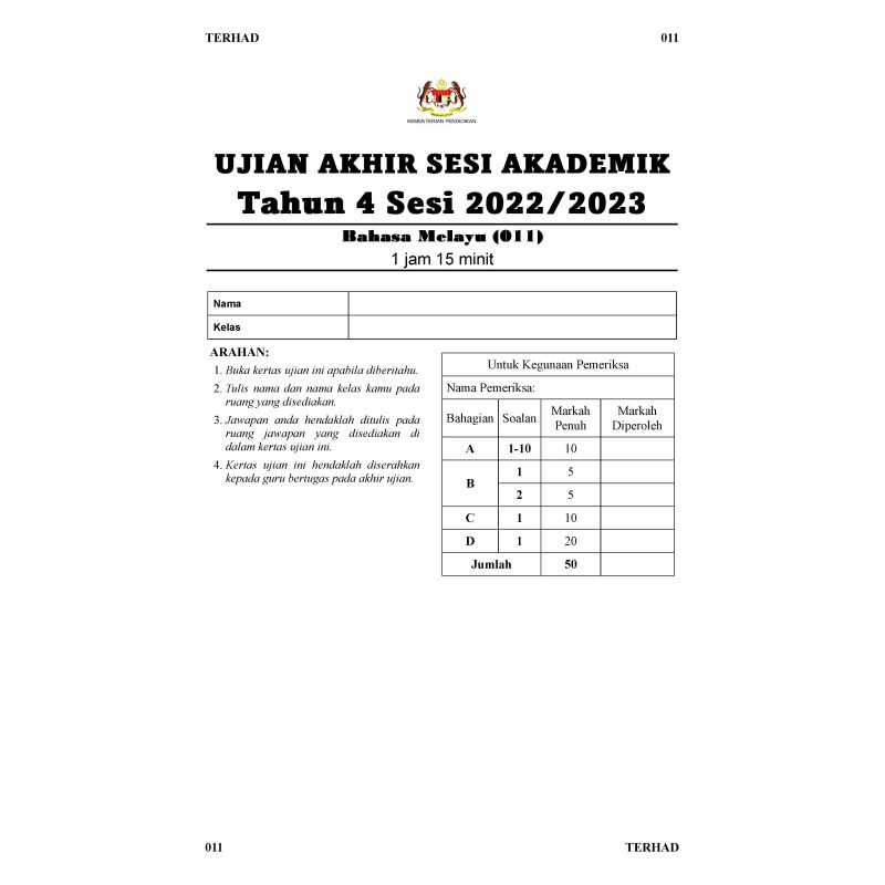 UJIAN AKHIR SESI AKADEMIK (UASA) - Tahun 4 Bahasa Melayu Sesi 2022/2023 - Kertas Ujian Digital dengan Jawapan Lengkap