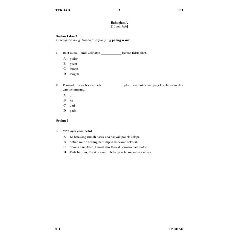 Kertas ujian komprehensif ini menyediakan pendidik dan pelajar dengan bahan penilaian yang autentik serta panduan pembelajaran melalui demonstrasi jawapan yang terperinci, menjadikannya sumber yang amat berharga untuk persediaan peperiksaan dan meningkatkan kemahiran Bahasa Melayu.
